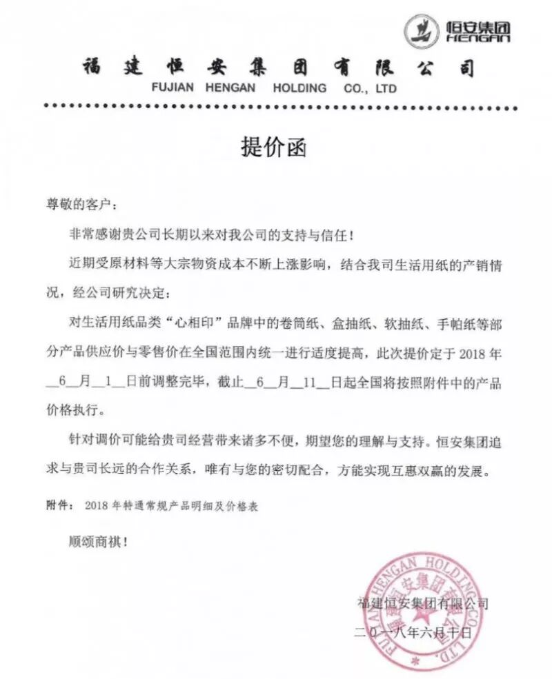 生活用纸行业的龙头公司维达国际的"维达",恒安国际的"心相印",金红叶纸业的"清风"近期纷纷发布涨价函。国际纸浆近1年疯涨47%,卫生纸涨价近期或难控制。