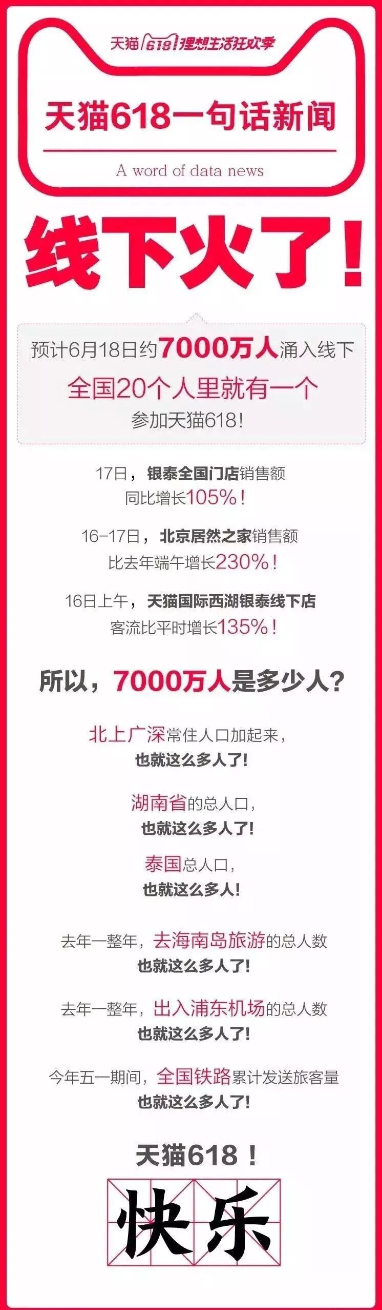 6、深圳福田星河COCOPARK一天涌入20万人,上海中山公园龙之梦购物广场涌入16万人。根据口碑的线下商户数据,天猫618首日带动商场消费金额同比增109%,交易笔数同比增73%。6月16日-17日,居然之家北京地区实现销售7.12亿元,同比去年端午期间销售增长231%。