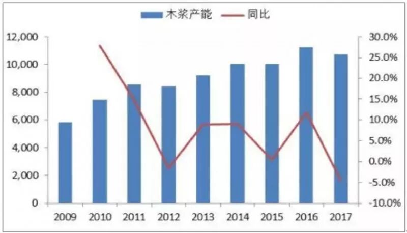 最近几年以来非木浆的比例一直下降,木浆与废纸浆在造纸原料中占的比例越来越高。2017年,我国木浆产能1.08亿吨,同比下降4.4%。由于环保政策趋严,我国近几年木浆产能扩张停滞,由于需求旺盛,产能利用率在2017年明显抬升,达到了99.09%,未来产能扩张受限,存量产能利用率已近尽头,对进口浆的依存度将逐年提高。